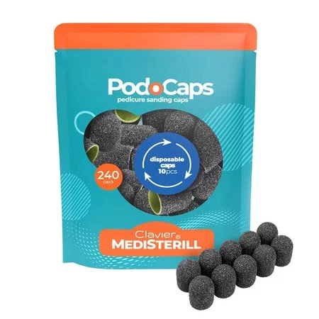 Kapturki ścierne MEDISTERILL do pedicure są dostępne w różnych kształtach i rozmiarach, aby pasowały do różnych rodzajów urządzeń. Najczęściej używane są kapturki na palce stóp, ale dostępne są także nakładki na pięty i stopy.