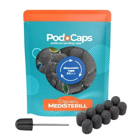 Kapturki ścierne MEDISTERILL do pedicure są dostępne w różnych kształtach i rozmiarach, aby pasowały do różnych rodzajów urządzeń. Najczęściej używane są kapturki na palce stóp, ale dostępne są także nakładki na pięty i stopy.