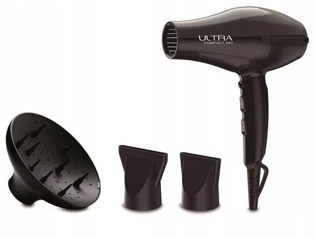 ULTRA COMPACT ION to profesjonalna suszarka do włosów z wyjątkowo niezawodnym i trwałym silnikiem o dużej mocy 2200W. Jej kompaktowa konstrukcja sprawia, że jest bardzo lekka i prosta w obsłudze. Zastosowana technologia Ion Plus wspomaga włosy w odbudowie ich molekularnej struktury: przywraca naturalne nawilżenie, zwiększa połysk i elastyczność oraz gwarantuje idealną, długotrwałą fryzurę bez elektryzowania. Grzałka suszarki pokryta została turmalinem, który dzięki swojej wysokiej mocy grzewczej zapewnia szybkie, perfekcyjne schnięcie, zapobiegając jednocześnie nadmiernemu narażeniu na ciepło. W skład zestawu wchodzą 2 ultra wąskie koncentratory przepływu powietrza (4mm i 8mm) oraz dyfuzor. Jej kompaktowa konstrukcja (19 cm) i zmniejszona waga (493g) sprawiają, że jest lekka i poręczna, idealna do codziennego użytku.