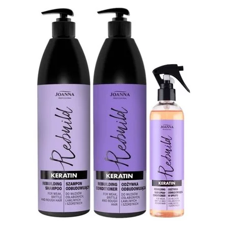 JOANNA Zestaw do włosów zniszczonych Szampon Odżywka Spray KERATIN 2x1000 + 300ml