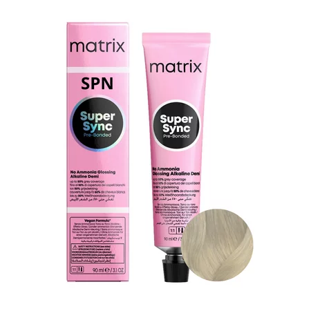 Alkaiczny toner do włosów Matrix Super Sync Pre-Bonded to rozświetlające tonery alkaliczne dające nawet 2 razy więcej blasku z całkowicie nowym kompleksem Pre-Bonded dla natychmiastowej ochrony struktury włosa. Zapewniają pokrycie do 50% siwych włosów. Wystarcza nawet do 2 aplikacji. Formuła wegańska.