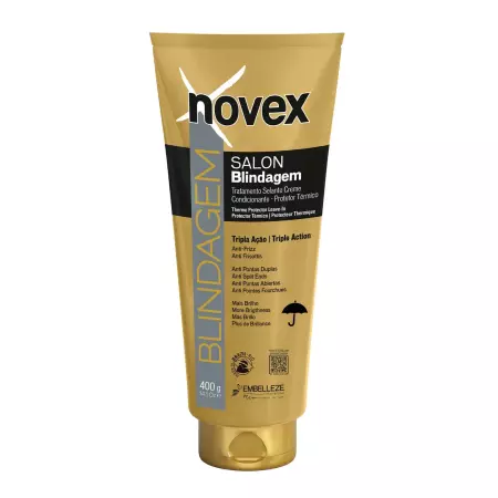 Novex Salon Blindagem działa termoochronnie, wzmacniając i uszczelniając łuski włosowe. Idealny do wszystkich rodzajów włosów, chroni również przed szkodliwym działaniem czynników zewnętrznych (zanieczyszczeniem), termicznych (podczas zabiegów, suszenia i prostowania) oraz nadmierną wilgocią, przedłużając trwałość efektu prostowania. Tworzy film, który optymalizuje połysk, nawilżenie i ułatwia układanie. Włosy są miękkie i lśniące.