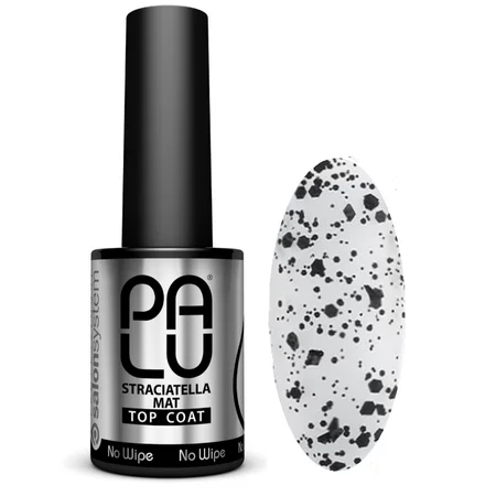 Top Straciatella Mat No Wipe od Palu pozwala uzyskać na paznokciach charakterystyczny nakrapiany efekt, który można porównać do czekoladowego deseru straciatella, puddingu z nasionkami wanilii czy przepiórczego jaja. Matowy przezroczysty top z czarnymi drobinkami to łatwy i szybki sposób, żeby całkowicie odmienić wygląd dowolnego lakieru hybrydowego i stworzyć ciekawy wizualnie manicure bez wysiłku i korzystania z dodatkowych narzędzi.