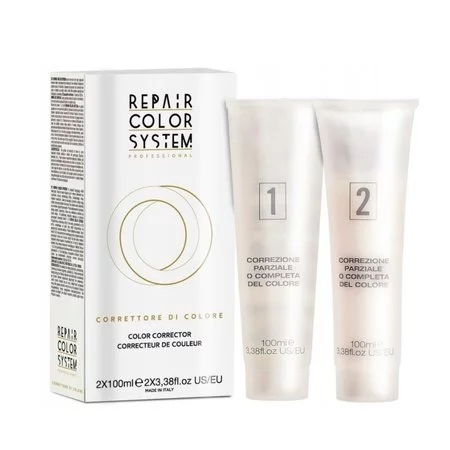 REPAIR COLOR SYSTEM to preparat korygujący efekt koloryzacji. Popzez swoje działanie jest w stanie całkowicie lub częściowo usunąć oksydacyjną farbę, pozostawiając włosy miękkie i nawilżone. Zaraz po usunięciu pigmentu, włosy mogą zostać ponownie poddane koloryzacji. Nie zawiera wody utlenionej ani amoniaku.