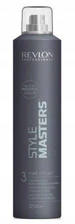Revlon Style Masters Pure 3 to lakier o mocnym utrwaleniu do każdego rodzaju włosów. Nie zawiera aerozolu. Ten profesjonalny specyfik gwarantuje maksymalne i długotrwałe utrwalenie. Innowacyjna formuła zawiera cenne składniki aktywne, których zadaniem jest nadanie naturalnego kształtu, wyróżnienie wszystkich kosmyków i pozostawienie ich jedwabiście miękkimi i gładkimi. Preparat nie skleja pukli, nie obciąża ich, dzięki temu nie tworzy nieatrakcyjnego efektu kopuły na głowie. Dodatkowo wzmacnia pasma, ożywia kolor i zapewnia olśniewający blask.