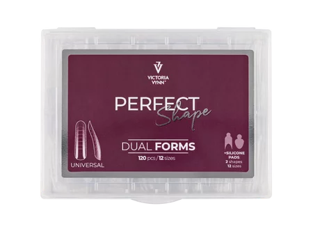 Universal - Każde opakowanie PERFECT Shape DUAL FORMS zawiera 120 sztuk foremek w dwunastu rozmiarach, od 0 do 11. Do zestawu dołączone są 2 rodzaje silikonowych szablonów do french manicure.